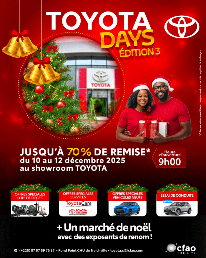 Après deux éditions mémorables, TOYOTA revient encore plus fort pour la 3ᵉ édition de son événement incontournable de Noël, les TOYOTA DAYS. Les 10, 11 et 12 décembre 2025, TOYOTA Côte d'Ivoire a le plaisir de vous inviter à vivre une atmosphère féérique dans les couleurs de noël, lors de ses journées TOYOTA DAYS ! ✨🎅 Au programme 🔽